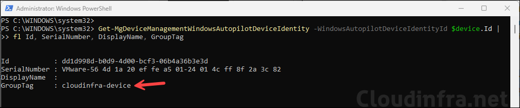 Get-MgDeviceManagementWindowsAutopilotDeviceIdentity -WindowsAutopilotDeviceIdentityId $device.Id | fl Id, SerialNumber, DisplayName, GroupTag