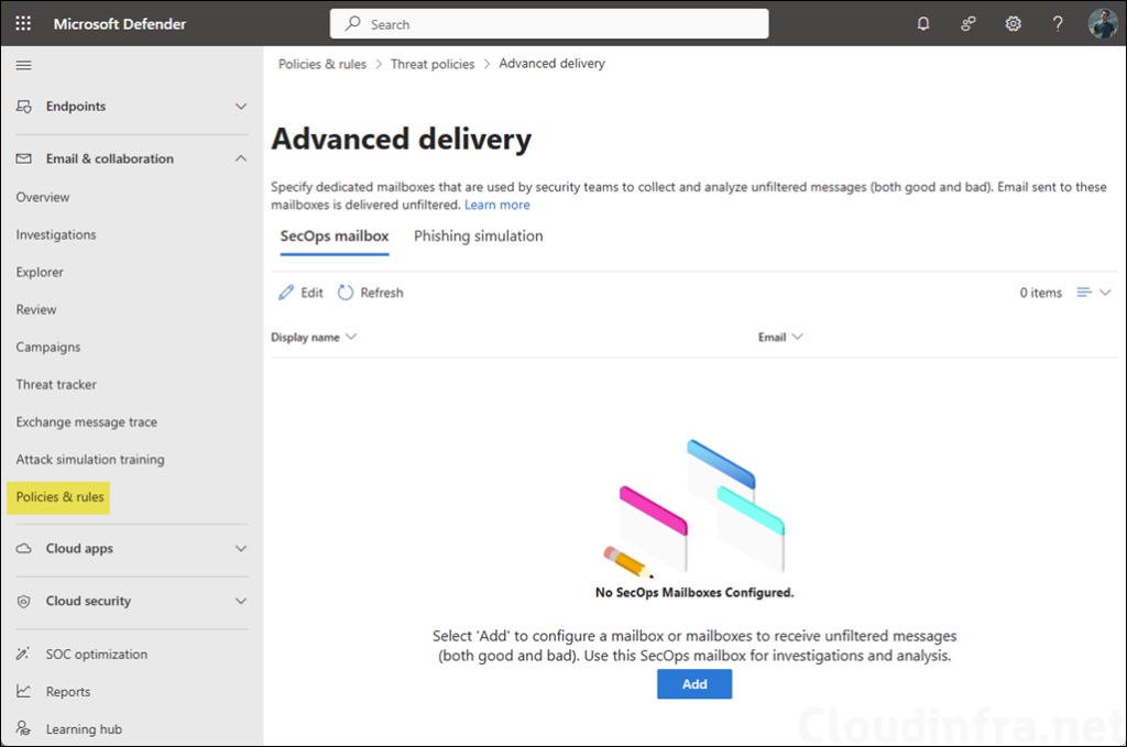 - SecOps mailbox tab: Add the mailbox (must be an Exchange Online mailbox).