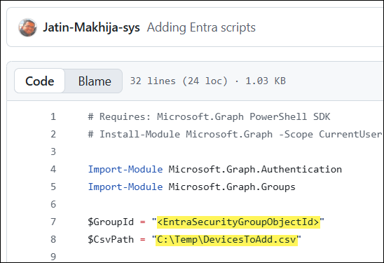 If you want to add devices to the Entra security group by using device names, use the PowerShell script Add_bulkDevice_using_names_Entra_Group.ps1. Update the $DeviceNames variable in the script with the device names you want to add. You can also modify the script to use a CSV file of device names instead of specifying the device names directly in the script.