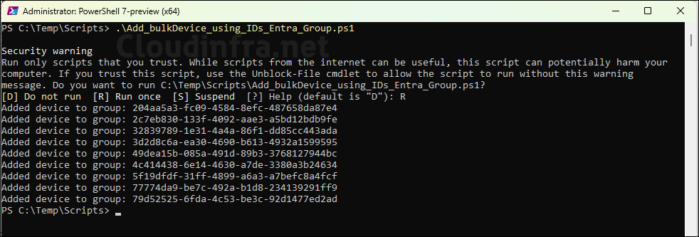 This script has been tested successfully on PowerShell version 7.6.0. The screenshot below shows the execution of the script, which adds devices from the DevicesToAdd.csv file to the specified group.