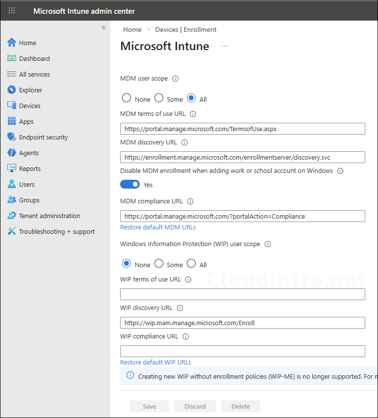 - Configure Windows Information Protection (WIP) user scope: set this to None. If WIP user scope is set to any other value, make sure the selected users aren’t a part of the MDM user scope. For more information, read Enable MDM automatic enrollment for Windows – Microsoft Intune | Microsoft Learn.