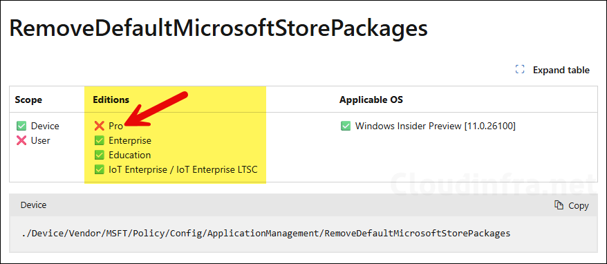 When you apply Remove Default Microsoft Store packages from system policy to remove default store packages from a device, you may see a Not applicable status. This typically indicates that the policy was applied to a Windows 11 Pro device. Currently, this policy is supported only on Windows 11 25H2 Enterprise and Education (EDU) editions.