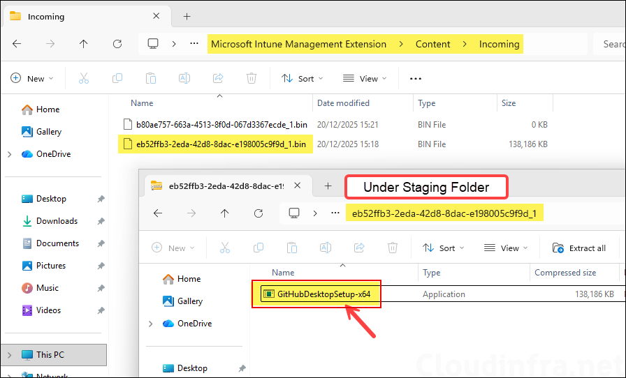 .bin). This is not directly usable. - C:\Program Files (x86)\Microsoft Intune Management Extension\Content\Staging is a temporary workspace where IME decrypts the downloaded payload. It is the area where IME expands/unpacks the payload, prepares the folder structure and metadata needed for execution, and may perform intermediate file operations before it is ready to run. Staging content is typically more transient and can be recreated or cleaned up as IME progresses.