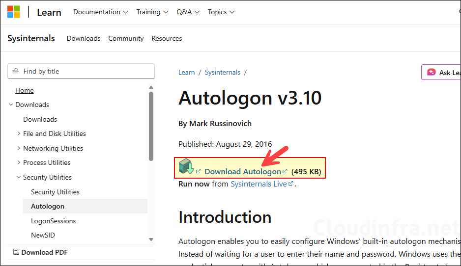 - Download Autologon from Microsoft website: Autologon – Sysinternals | Microsoft Learn.