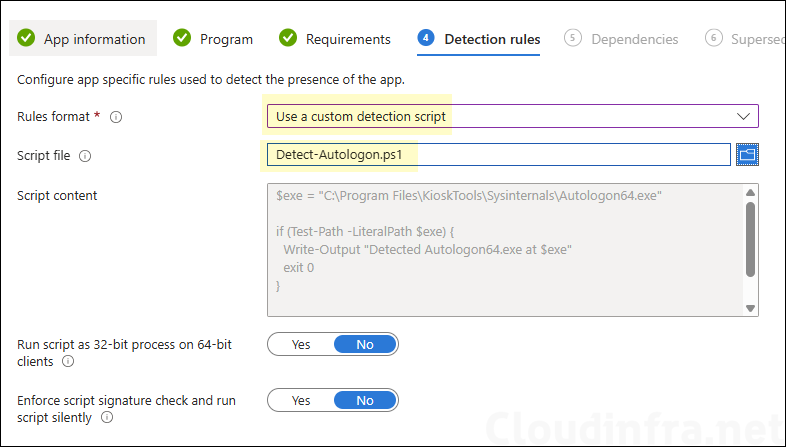 - Detection rules: Download Detect-Autologon.ps1 script from Powershell-Scripts/Intune/Windows11/Kiosk Mode/Deploy_Autologon64 · GitHub.
