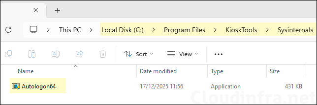 - Sign in to one of the target Windows devices and navigate to C:\Program Files\KioskTools\Sysinternals. Confirm that Autologon64.exe exists in this location. This is an important step before proceeding to configure autologon for the Entra ID user.