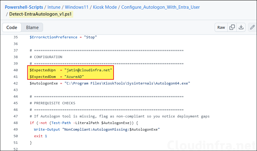 After you download Detect-EntraAutologon_v1.ps1 and Remediate_Entra_Autologon_v1.ps1 scripts, update the Entra user information in the scripts.