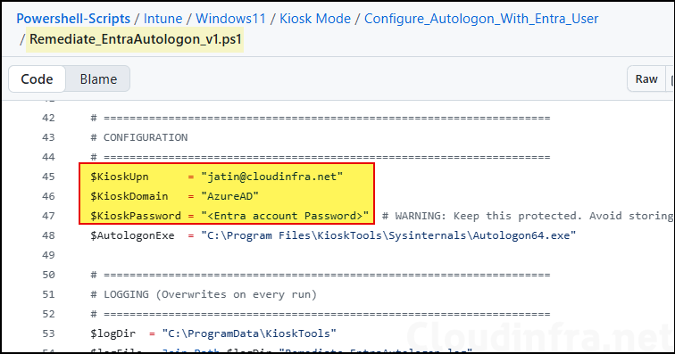 $kioskUpnand$KioskPasswordvariables. Keep$KioskDomainas Azure AD for Entra ID user. If it’s an Active Directory domain user, update the domain accordingly.
