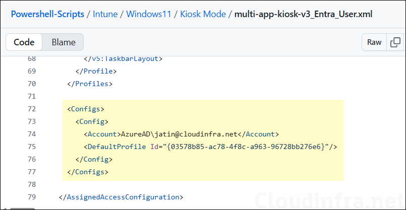 In the multi-app kiosk XML file, update the Config section with the Entra ID user account configured for autologon. For reference, I have uploaded an XML file that uses an Entra ID user account in my GitHub repository: Powershell-Scripts/Intune/Windows11/Kiosk Mode · GitHub.
