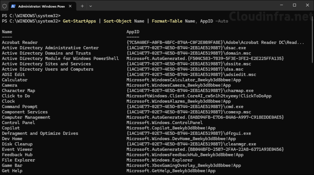 If you do not find the app in the list after running the commands, then it could be possible that the app is not installed. Install the app and then rerun the command to get the AUMID info.