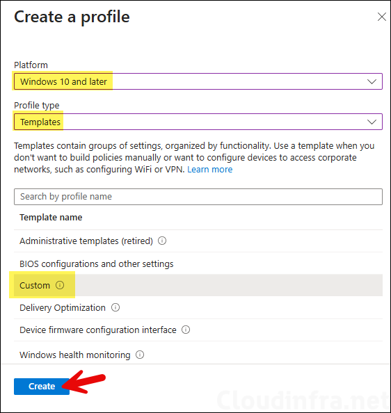 - Sign in to the Intune admin center and go to Devices > Windows > Configuration > + Create > New Policy. Platform: Select Windows 10 and later, Profile type: Select Templates.