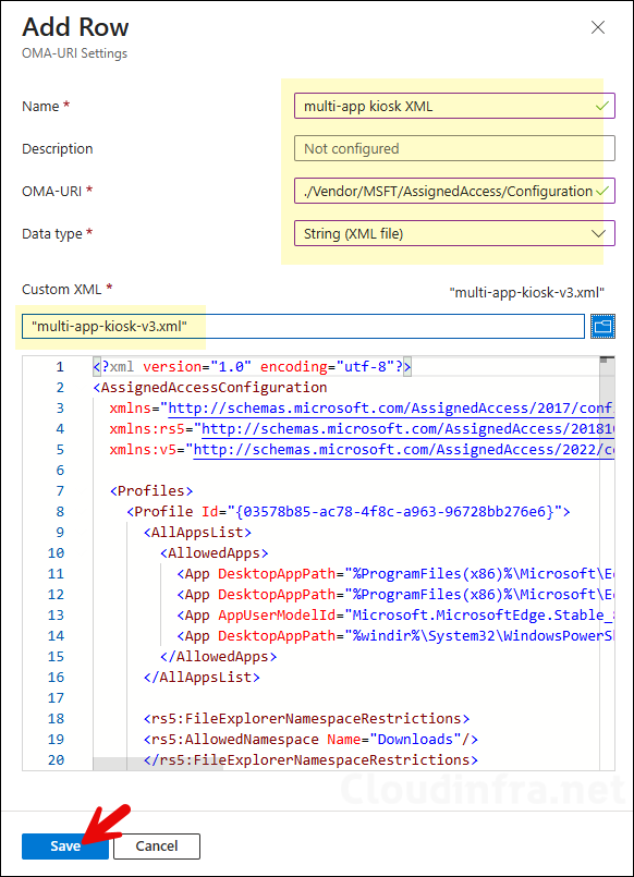 - OMA-URI: ./Vendor/MSFT/AssignedAccess/Configuration