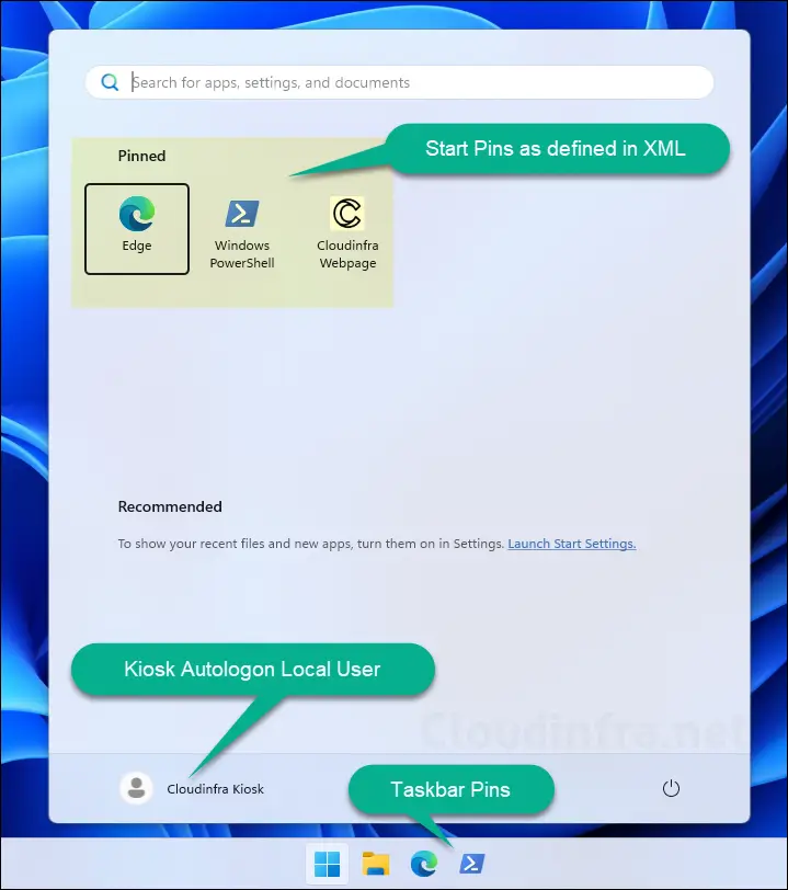 In the next steps, I will create a custom device configuration profile using the AssignedAccess CSP. The OMA-URI setting which I will use is ./Vendor/MSFT/AssignedAccess/Configuration. Once this profile is applied to the devices, the multi-app kiosk mode will take effect. Since an auto-logon account is configured, the device will automatically sign in after each restart and launch the website, https://cloudinfra.net (as per XML file). You’ll also see the Start menu pins, taskbar pins, and overall setup as defined in the configuration file.