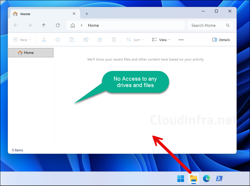 If the File Explorer namespace restrictions block is missing, or if you add the block shown below, all drive and file access will be completely blocked. The screenshot below shows that when File Explorer is opened, no contents are visible or accessible to the user.