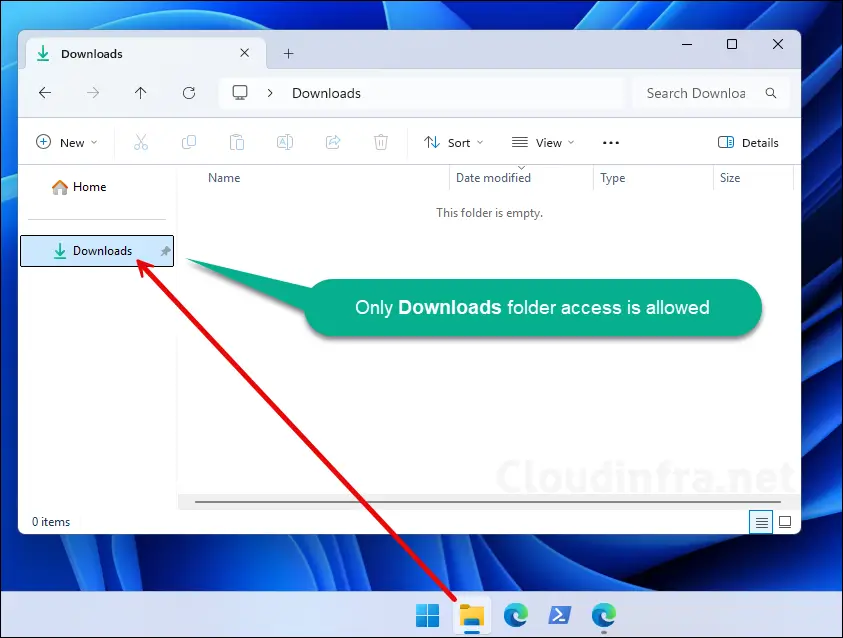 In my XML configuration file, I added below code to allow access to the Downloads folder. The screenshot shows that when a user opens File Explorer, only the Downloads folder is visible, while all other folders and drives are hidden.