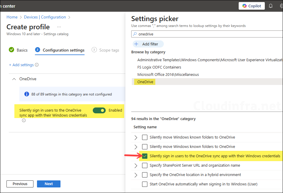 Before moving on to the steps for creating a policy to silently move known Windows folders to OneDrive, it is important to highlight a recommended policy that you should enable. This policy is available in the Settings catalog and is called Silently sign in users to the OneDrive sync app with their Windows credentials. When this policy is enabled and applied, Known Folder Move (KFM) can run without requiring users to manually sign in to OneDrive. For more information, go to the link: IT Admins – Use OneDrive policies to control sync settings – SharePoint in Microsoft 365 | Microsoft Learn.